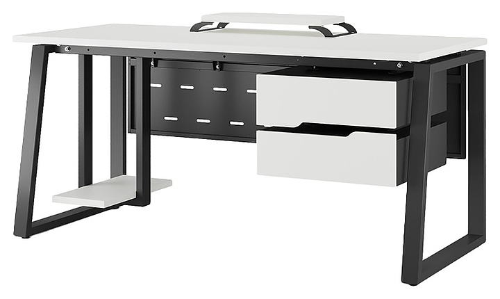 Компьютерный стол Кобор KTS1-180/60 black/premium используется в офисных помещениях и кабинетах руководителей. Модель оснащена опорами в форме наклонной трапеции. Каркас выполнен из металла, выкрашенного в цвет черный муар (RAL9005), столешница – из ламинированной древесно-стружечной плиты (ЛДСП) цвета белый премиум (W1000 S9). Опции (заказываются отдельно):
