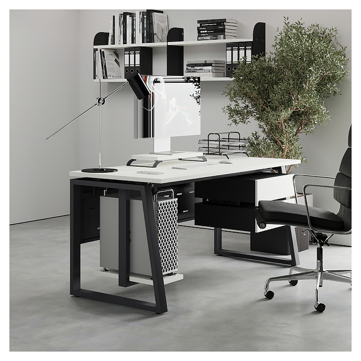 Компьютерный стол Кобор KTS1-120/70 black/premium используется в офисных помещениях и кабинетах руководителей. Модель оснащена опорами в форме наклонной трапеции. Каркас выполнен из металла, выкрашенного в цвет черный муар (RAL9005), столешница – из ламинированной древесно-стружечной плиты (ЛДСП) цвета белый премиум (W1000 S9). Опции (заказываются отдельно):