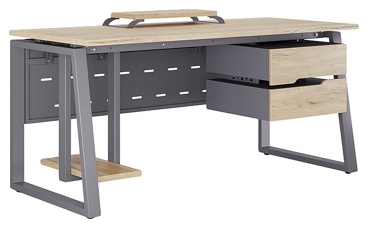 Компьютерный стол Кобор КTS1-80/80 graphite/natural используется в офисных помещениях и кабинетах руководителей. Модель оснащена опорами в форме наклонной трапеции. Каркас выполнен из металла, выкрашенного в цвет графит муар (RAL7024), столешница – из ламинированной древесно-стружечной плиты (ЛДСП) цвета натуральный дуб (H1180 ST37). Опции (заказываются отдельно):