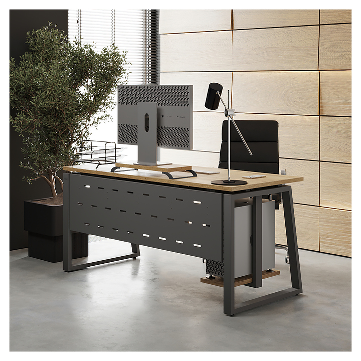 Компьютерный стол Кобор KTS1-100/80 aluminum/natural используется в офисных помещениях и кабинетах руководителей. Модель оснащена опорами в форме наклонной трапеции. Каркас выполнен из металла, выкрашенного в цвет алюминиевый металлик (RAL9006), столешница – из ламинированной древесно-стружечной плиты (ЛДСП) цвета натуральный дуб (H1180 ST37). Опции (заказываются отдельно):