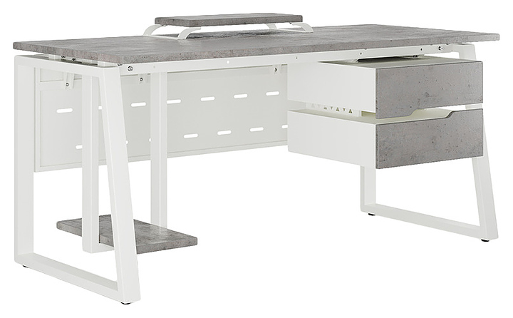 Компьютерный стол Кобор КTS1-80/80 white/chicago используется в офисных помещениях и кабинетах руководителей. Модель оснащена опорами в форме наклонной трапеции. Каркас выполнен из металла, выкрашенного в цвет белый муар (RAL9016), столешница – из ламинированной древесно-стружечной плиты (ЛДСП) цвета бетон чикаго (F186 ST9). Опции (заказываются отдельно):