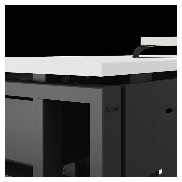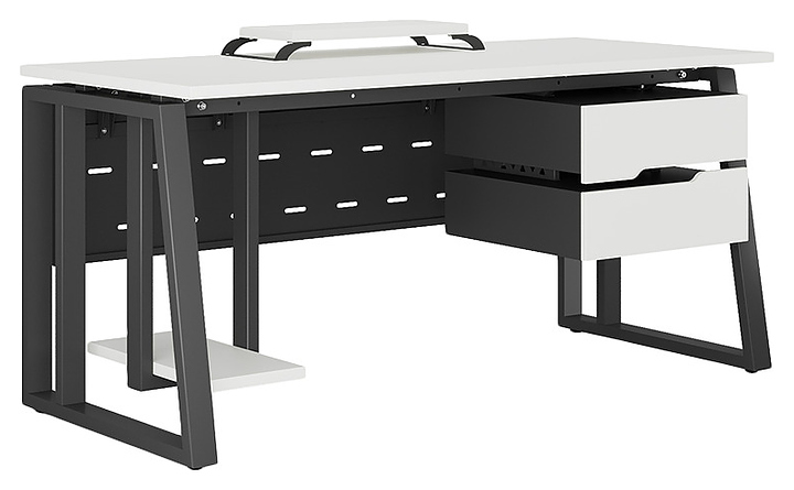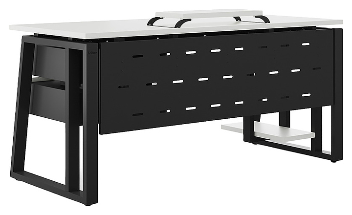 Компьютерный стол Кобор КTS2-160/70 black/premium используется в офисных помещениях и кабинетах руководителей. Модель оснащена усиленными вертикальными балками опорами в форме наклонной трапеции. Каркас выполнен из металла, выкрашенного в цвет черный муар (RAL9005), столешница – из ламинированной древесно-стружечной плиты (ЛДСП) цвета белый премиум (W1000 S9). Опции (заказываются отдельно):