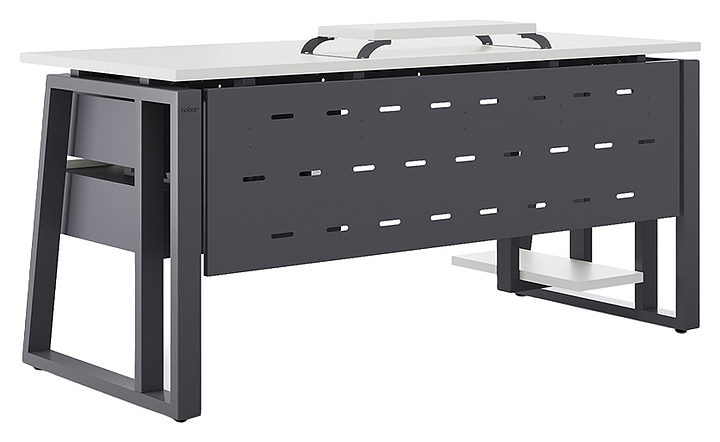 Компьютерный стол Кобор КTS2-180/70 graphite/premium используется в офисных помещениях и кабинетах руководителей. Модель оснащена усиленными вертикальными балками опорами в форме наклонной трапеции. Каркас выполнен из металла, выкрашенного в цвет графит муар (RAL7024), столешница – из ламинированной древесно-стружечной плиты (ЛДСП) цвета белый премиум (W1000 ST9). Опции (заказываются отдельно):