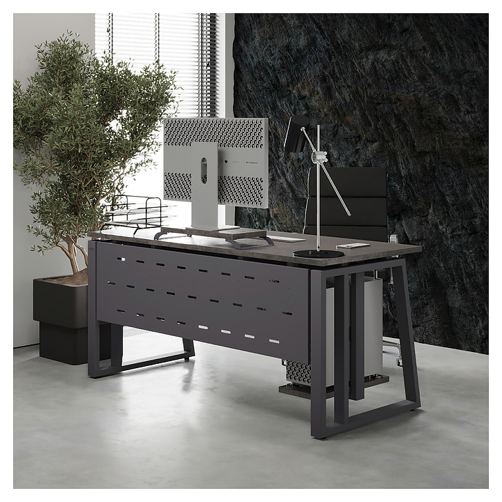 Компьютерный стол Кобор КTS2-80/60 graphite/chicago используется в офисных помещениях и кабинетах руководителей. Модель оснащена усиленными вертикальными балками опорами в форме наклонной трапеции. Каркас выполнен из металла, выкрашенного в цвет графит муар (RAL7024), столешница – из ламинированной древесно-стружечной плиты (ЛДСП) цвета бетон чикаго (F186 ST9). Опции (заказываются отдельно):