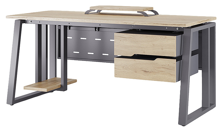 Компьютерный стол Кобор KTS2-180/60 graphite/natural используется в офисных помещениях и кабинетах руководителей. Модель оснащена усиленными вертикальными балками опорами в форме наклонной трапеции. Каркас выполнен из металла, выкрашенного в цвет графит муар (RAL7024), столешница – из ламинированной древесно-стружечной плиты (ЛДСП) цвета натуральный дуб (H1180 ST37). Опции (заказываются отдельно):