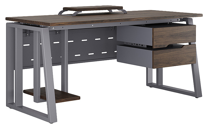 Компьютерный стол Кобор KTS2-100/80 graphite/charlston используется в офисных помещениях и кабинетах руководителей. Модель оснащена усиленными вертикальными балками опорами в форме наклонной трапеции. Каркас выполнен из металла, выкрашенного в цвет графит муар (RAL7024), столешница – из ламинированной древесно-стружечной плиты (ЛДСП) цвета дуб чарльстон (H3154 ST36). Опции (заказываются отдельно):