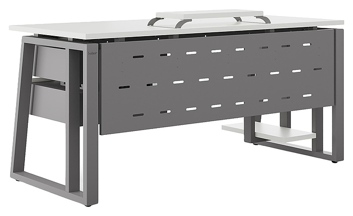Компьютерный стол Кобор KTS2-120/60 aluminum/premium используется в офисных помещениях и кабинетах руководителей. Модель оснащена усиленными вертикальными балками опорами в форме наклонной трапеции. Каркас выполнен из металла, выкрашенного в цвет алюминиевый металлик (RAL9006), столешница – из ламинированной древесно-стружечной плиты (ЛДСП) цвета белый премиум (W1000 ST9). Опции (заказываются отдельно):