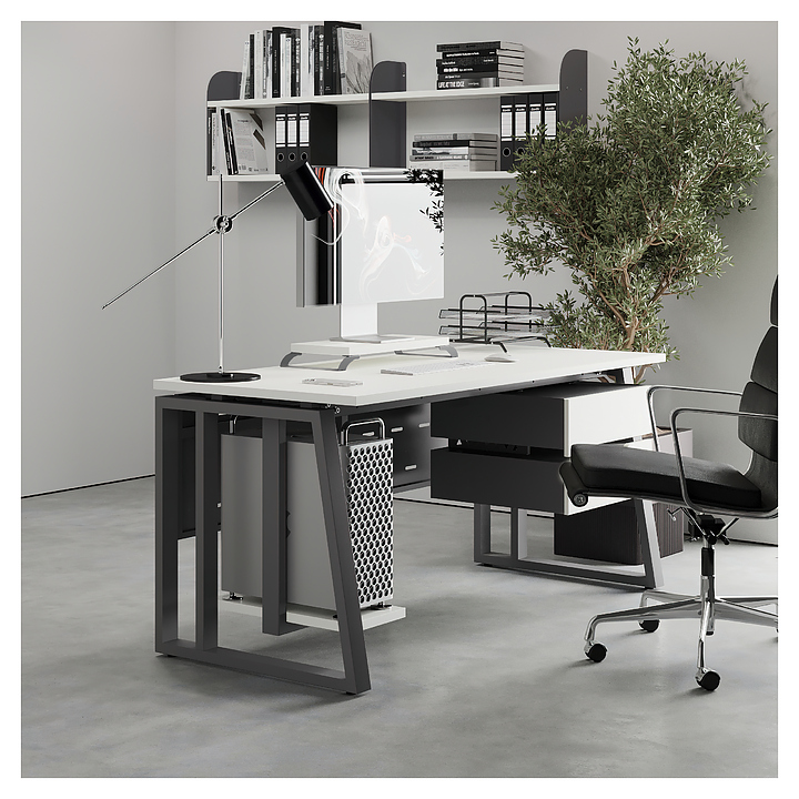 Компьютерный стол Кобор KTS2-160/60 aluminum/premium используется в офисных помещениях и кабинетах руководителей. Модель оснащена усиленными вертикальными балками опорами в форме наклонной трапеции. Каркас выполнен из металла, выкрашенного в цвет алюминиевый металлик (RAL9006), столешница – из ламинированной древесно-стружечной плиты (ЛДСП) цвета белый премиум (W1000 ST9). Опции (заказываются отдельно):