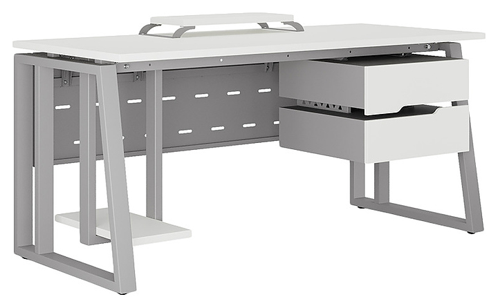 Компьютерный стол Кобор КTS2-140/80 aluminum/premium используется в офисных помещениях и кабинетах руководителей. Модель оснащена усиленными вертикальными балками опорами в форме наклонной трапеции. Каркас выполнен из металла, выкрашенного в цвет алюминиевый металлик (RAL9006), столешница – из ламинированной древесно-стружечной плиты (ЛДСП) цвета белый премиум (W1000 ST9). Опции (заказываются отдельно):