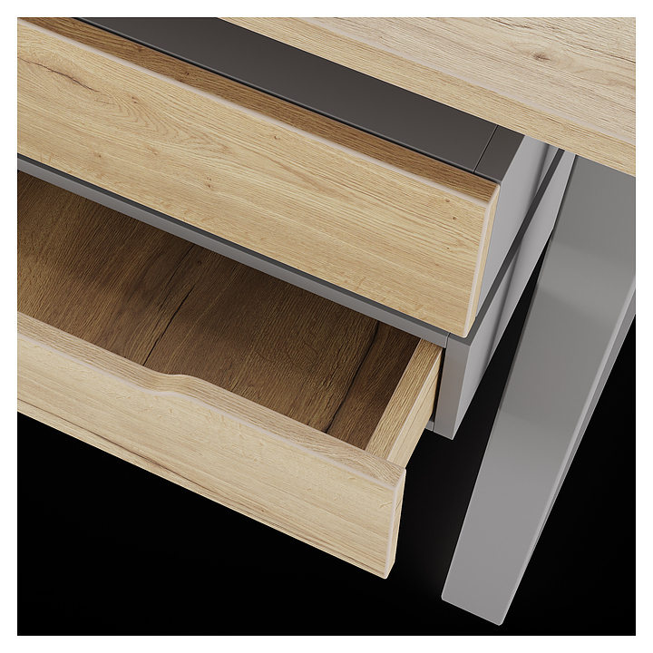 Компьютерный стол Кобор KTS2-160/60 aluminum/natural используется в офисных помещениях и кабинетах руководителей. Модель оснащена усиленными вертикальными балками опорами в форме наклонной трапеции. Каркас выполнен из металла, выкрашенного в цвет алюминиевый металлик (RAL9006), столешница – из ламинированной древесно-стружечной плиты (ЛДСП) цвета натуральный дуб (H1180 ST37). Опции (заказываются отдельно):