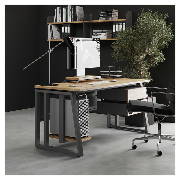 Компьютерный стол Кобор KTS2-180/60 aluminum/natural используется в офисных помещениях и кабинетах руководителей. Модель оснащена усиленными вертикальными балками опорами в форме наклонной трапеции. Каркас выполнен из металла, выкрашенного в цвет алюминиевый металлик (RAL9006), столешница – из ламинированной древесно-стружечной плиты (ЛДСП) цвета натуральный дуб (H1180 ST37). Опции (заказываются отдельно):