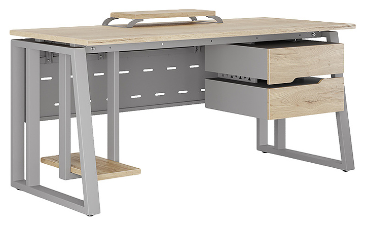 Компьютерный стол Кобор KTS2-120/70 aluminum/natural используется в офисных помещениях и кабинетах руководителей. Модель оснащена усиленными вертикальными балками опорами в форме наклонной трапеции. Каркас выполнен из металла, выкрашенного в цвет алюминиевый металлик (RAL9006), столешница – из ламинированной древесно-стружечной плиты (ЛДСП) цвета натуральный дуб (H1180 ST37). Опции (заказываются отдельно):