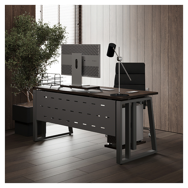 Компьютерный стол Кобор KTS2-80/60 aluminum/charlston используется в офисных помещениях и кабинетах руководителей. Модель оснащена усиленными вертикальными балками опорами в форме наклонной трапеции. Каркас выполнен из металла, выкрашенного в цвет алюминиевый металлик (RAL9006), столешница – из ламинированной древесно-стружечной плиты (ЛДСП) цвета дуб чарльстон (H3154 ST36). Опции (заказываются отдельно):