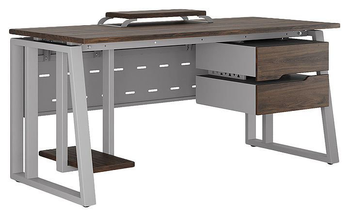 Компьютерный стол Кобор КTS2-160/80 aluminum/charlston используется в офисных помещениях и кабинетах руководителей. Модель оснащена усиленными вертикальными балками опорами в форме наклонной трапеции. Каркас выполнен из металла, выкрашенного в цвет алюминиевый металлик (RAL9006), столешница – из ламинированной древесно-стружечной плиты (ЛДСП) цвета дуб чарльстон (H3154 ST36). Опции (заказываются отдельно):
