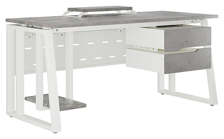 Компьютерный стол Кобор KTS2-160/70 white/chicago используется в офисных помещениях и кабинетах руководителей. Модель оснащена усиленными вертикальными балками опорами в форме наклонной трапеции. Каркас выполнен из металла, выкрашенного в цвет белый муар (RAL9016), столешница – из ламинированной древесно-стружечной плиты (ЛДСП) цвета бетон чикаго (F186 ST9). Опции (заказываются отдельно):