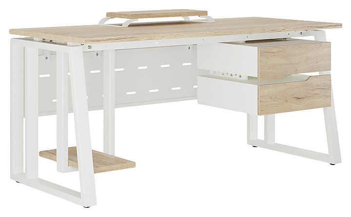 Компьютерный стол Кобор КTS2-140/60 white/natural используется в офисных помещениях и кабинетах руководителей. Модель оснащена усиленными вертикальными балками опорами в форме наклонной трапеции. Каркас выполнен из металла, выкрашенного в цвет белый муар (RAL9016), столешница – из ламинированной древесно-стружечной плиты (ЛДСП) цвета натуральный дуб (H1180 ST37). Опции (заказываются отдельно):