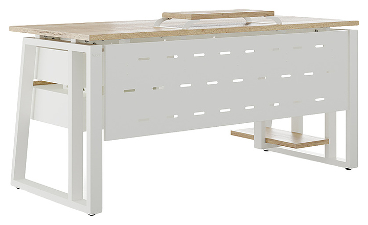 Компьютерный стол Кобор КTS2-140/70 white/natural используется в офисных помещениях и кабинетах руководителей. Модель оснащена усиленными вертикальными балками опорами в форме наклонной трапеции. Каркас выполнен из металла, выкрашенного в цвет белый муар (RAL9016), столешница – из ламинированной древесно-стружечной плиты (ЛДСП) цвета натуральный дуб (H1180 ST37). Опции (заказываются отдельно):