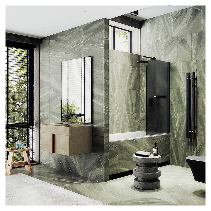 Шторка на ванну с полотенцедержателем MaybahGlass MGV-786-6 70х140 см, распашная, графит матовый, черный