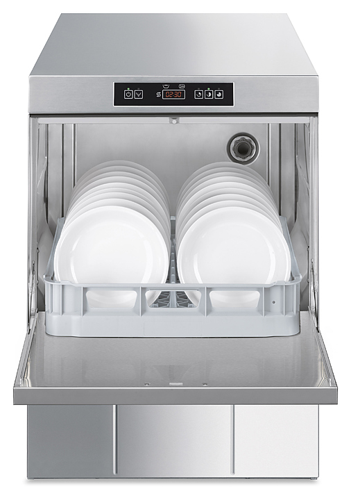 Посудомоечная машина с фронтальной загрузкой Smeg SPD503 серии Ecoline используется на предприятиях общественного питания и торговли для мойки столовых приборов, тарелок, стаканов, чашек и другой посуды. Модель оснащена электронной панелью управления. Корпус выполнен из нержавеющей стали AISI 304. Комплектация: