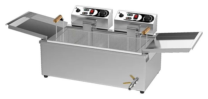 Чебуречница Airhot EC-38 предназначена для приготовления чебуреков, пирожков, картофеля-фри, сыра, рыбных палочек и других продуктов путем обжарки в большом количестве масла на предприятиях общественного питания и торговли. Модель оснащена электромеханической панелью управления с регулятором температуры, термостатом и поддоном для стекания масла с продукта обратно в ванну. Корпус выполнен из нержавеющей стали, ручки корзин - из термостойкого пластика. В комплект поставки входят корзина и решетка для чебуреков. Особенности: