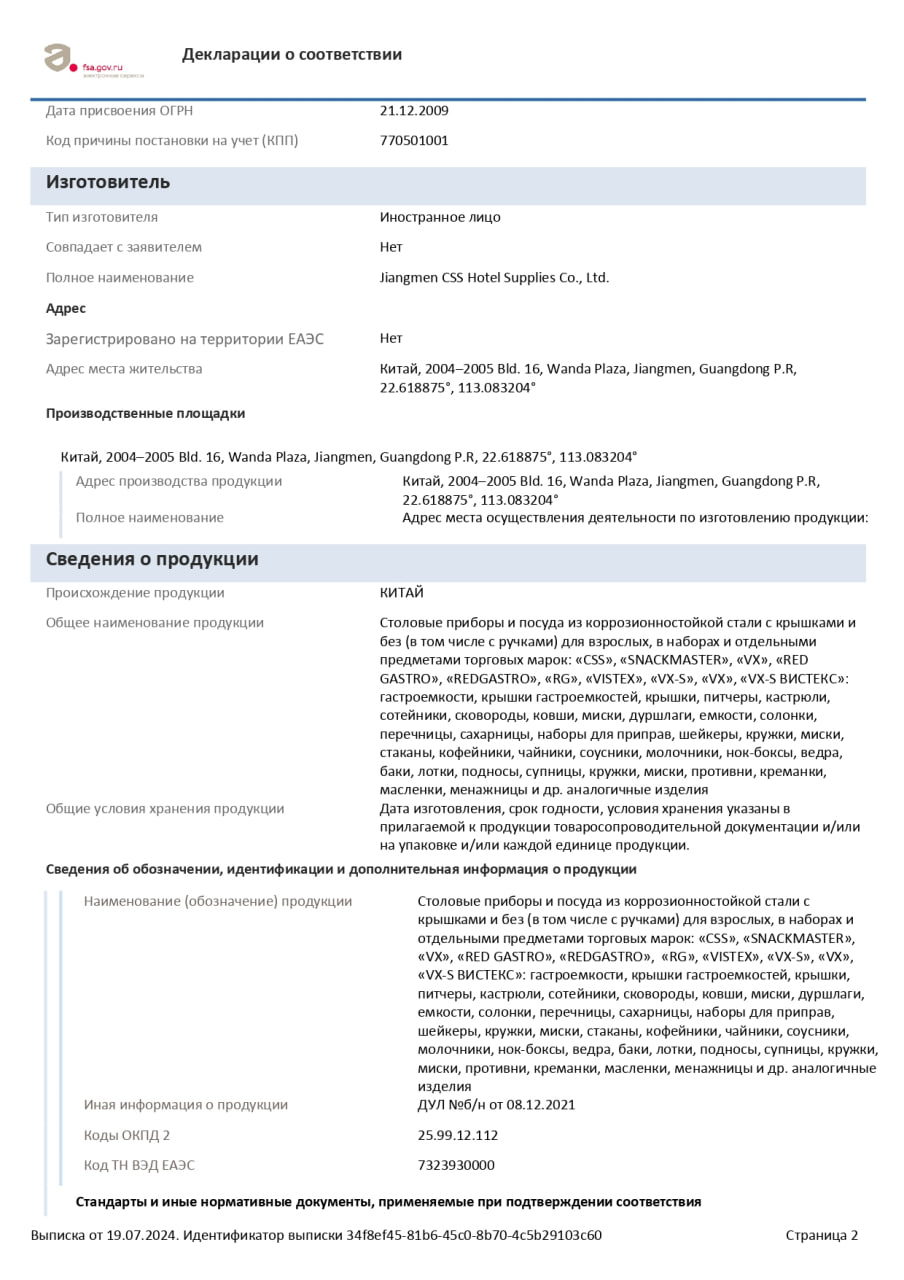 Гастроемкость VX-S GN 1/1-200 предназначена для использования на кухне заведений общественного питания, хранения, транспортировки, приготовления и подачи различных продуктов и блюд, в продуктовых магазинах, супер- и гипермаркетах при выкладке продукции в холодильных витринах, хранения и транспортировки в холодильных и морозильных камерах, на пищевых производствах для приготовления, подогрева и хранения блюд или продуктов питания. Изделие выполнено из нержавеющей стали 201 толщиной 0,7 мм, устойчивой к ржавчине и деформации при высоких или низких температурах. Внимание! Информация о товарах, размещенная на сайте, не является публичной офертой, определяемой положениями Части 2 Статьи 437 Гражданского кодекса Российской Федерации. Производители вправе вносить изменения в технические характеристики, внешний вид и комплектацию товаров без предварительного уведомления. Уточняйте характеристики у наших менеджеров перед оформлением заказа. Совместимость ![]() В наличии газ, 220 В; 10; универсальный (GN 1/1, 600x400); электронная; Автоматическая мойка; 0.58 кВт 675 169 р. −8%В наличии Среднетемпературный; от 0 до 8 °С; нерж. сталь; Гастронормированный; 2; с бортом; 970 мм; 700 мм 119 701 р. 130 110 р. ![]() В наличии Среднетемпературный; от 0 до 8 °С; нерж. сталь; Гастронормированный; 3; с бортом; 1460 мм; 700 мм 146 902 р. ![]() В наличии Среднетемпературный; от 0 до 8 °С; нерж. сталь; Гастронормированный; 2; с бортом; 1340 мм; 700 мм 192 118 р. −6%Под заказ от 2 до 12 °С; нерж. сталь; Гастронормированный; 4; без борта; 1260 мм; 700 мм 222 250 р. 236 436 р. |