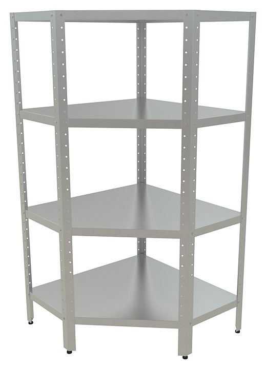 Угловой кухонный стеллаж Кобор СКУ-5/6-100/90/430 предназначен для хранения посуды, различного инвентаря и сухих продуктов на предприятиях общественного питания и торговли. Модель оснащена сплошными полками. Разборный каркас выполнен из уголка из нержавеющей стали AISI 430, полки - из нержавеющей стали AISI 430. Дополнительные характеристики: