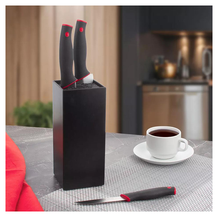 Набор ножей Arcos Duo AR141015 предназначен для нарезки и разделки различных продуктов на предприятиях общественного питания и торговли. Рукоятки изготовлены из полипропилена, отличающегося устойчивостью к воздействию влаги, слабых щелочных и кислотных растворов, высокой температуры и коррозии, долгое время сохраняют свою целостность и внешний вид. Клинки выполнены из стального сплава NITRUM, устойчивого к коррозии и долговечного, длительно сохраняющего остроту режущей кромки и первоначальный внешний вид во время всего периода эксплуатации. Подставка изготовлена из бумажно-слоистого композитного материала. Комплектация: