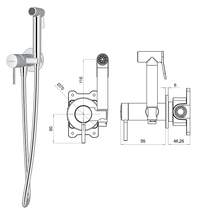 Гигиенический душ Teska Pulito BTK6801 предназначен для проведения гигиенических процедур в туалетных комнатах. Модель оснащена ручной лейкой и душевым шлангом. Изделие выполнено из латуни, отличающейся прочностью, долговечностью и устойчивостью к перепадам температур. В комплект поставки входит внутреннняя часть, гигиенический душ и душевой шланг. Особенности: