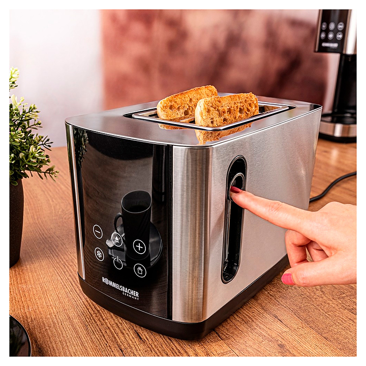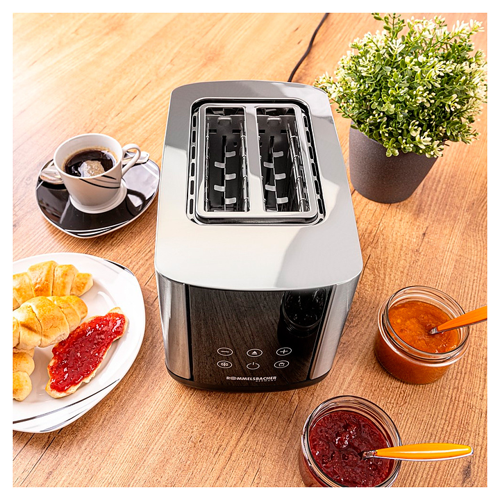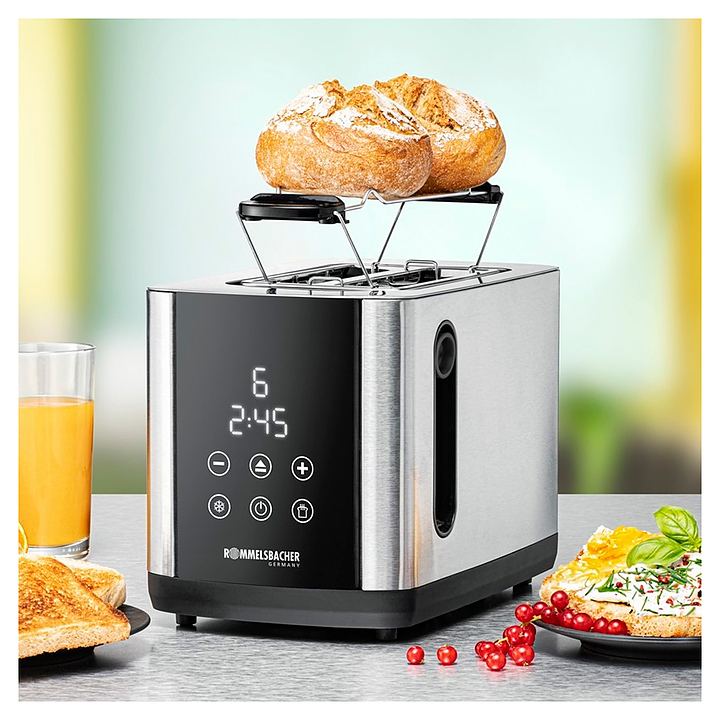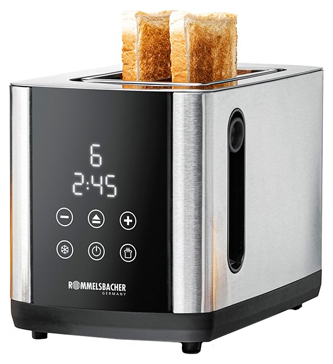 Тостер Rommelsbacher TO 850 предназначен обжаривания ломтиков тостового хлеба в частных домах, квартирах, отелях и офисах. Модель оснащена 2 широкими слотами для тостов, светодиодным дисплеем с сенсорной панелью управления, держателем для разогрева булочек и прорезиненными ножками. Корпус выполнен из нержавеющей стали. Особенности:
