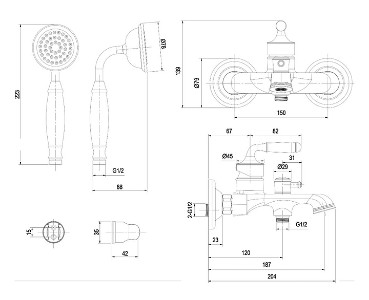 Смеситель для ванны и душа ESKO Prague PG54new предназначен для подачи горячей и холодной воды в ванных помещениях. Керамический картридж обеспечивает плавный ход рычага смесителя, контроль и точность при выборе напора и температуры воды. Изделие выполнено из латуни, отличающейся прочностью, долговечностью и устойчивостью к перепадам температуры, шланг - в металлической оплетке, переключатель - из керамики. В комплект поставки входят эксцентрики, отражатели, душевой шланг, лейка и настенный держатель для лейки. Особенности: