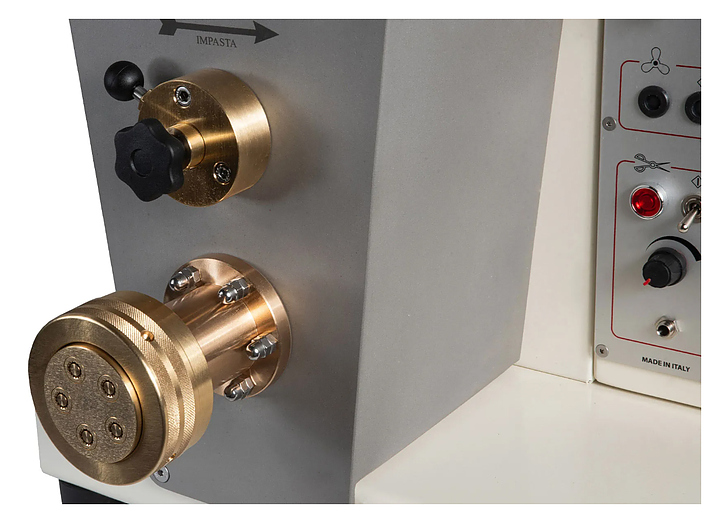 Машина для пасты Bottene PM35 используется на предприятиях общественного питания и торговли для производства макаронных изделий из любых типов муки, а также цветной пасты с добавлением дополнительных ингредиентов. Модель сочетает в себе тестомес и экструдер для выдавливания макарон, оснащена съемными для очистки шнеком и миксером, щеткой и лопаткой для чистки. Корпус выполнен из окрашенной стали, чаша и миксер - из нержавеющей стали. Дополнительно необходимо заказать 4 штампа (из ассортимента). Особенности: