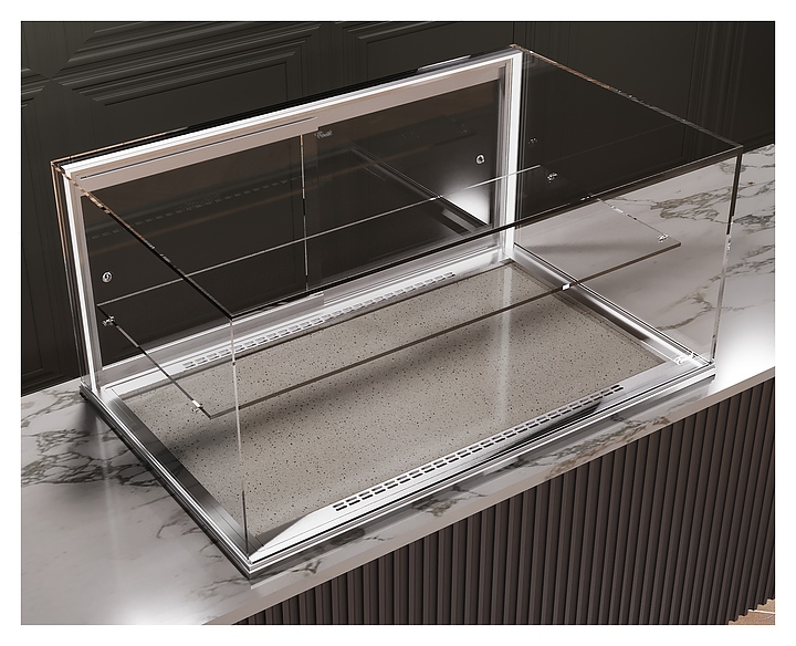 Встраиваемая кондитерская витрина Finist Glassier812 Stone Gst812-9/50/5 предназначена для кратковременного хранения и предпродажной демонстрации десертов и кондитерских изделий на предприятиях общественного питания и торговли. Модель может монтироваться в столешницу из любого материала, что позволяет легко интегрировать в любой интерьер. Витрина оснащена светодиодной подсветкой и полкой. Каркас выполнен из зеркальной нержавеющей стали, купол - из просветленного стекла, зона выкладки - из искусственного камня, который отличается прочностью, долговечностью, гигиеничностью, легко очищается и не впитывает запахи. Особенности: