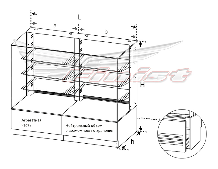 Напольная кондитерская витрина Finist AIR DOUBLE LUX ADL-160-7-163 предназначена для кратковременного хранения и предпродажной демонстрации десертов и кондитерских изделий на предприятиях общественного питания и торговли. Модель оснащена раздвижными дверьми-купе, полками и подсветкой. Фасады выполнены из МДФ, полки - из стекла, дно витрины - из зеркальной нержавеющей стали. Особенности: