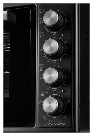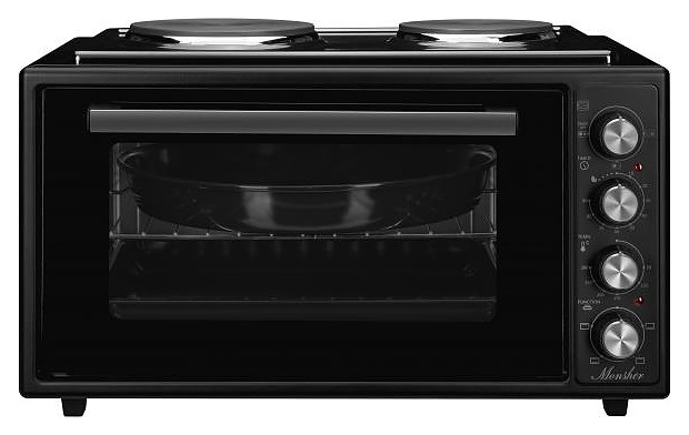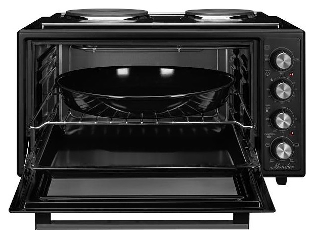 Электрическая мини-печь Monsher MMC 4850 Noir предназначена для приготовления горячих сэндвичей и других блюд, выпекания хлебобулочных и кондитерских изделий, подогрева готовых блюд и ингридиентов, а также заквашивания йогурта и размораживания полуфабрикатов в гостиницах, офисах и домашних условиях. Модель оснащена 2 конфорками различной мощности на верхней панели, жарочной камерой с верхним и нижним нагревательными элементами, верхним грилем, 4 уровнями интегрированных в боковые стенки направляющих для противней, откидной дрерью со смотровым окном, горизонтальной рукояткой, кабелем питания с вилкой и расположенной с правой стороны фронта электромеханической панелью управления с 4 поворотными переключателями. Корпус выполнен из высококачественной стали с антикоррозийным покрытием черного цвета, дверь с полным остеклением фронта, фурнитура в комбинации черного и серебристого тонов. В комплект поставки входят 2 противня: круглый глубокий и стандартный, решетка, инструкция по эксплуатации и гарантийный талон. Особенности:
