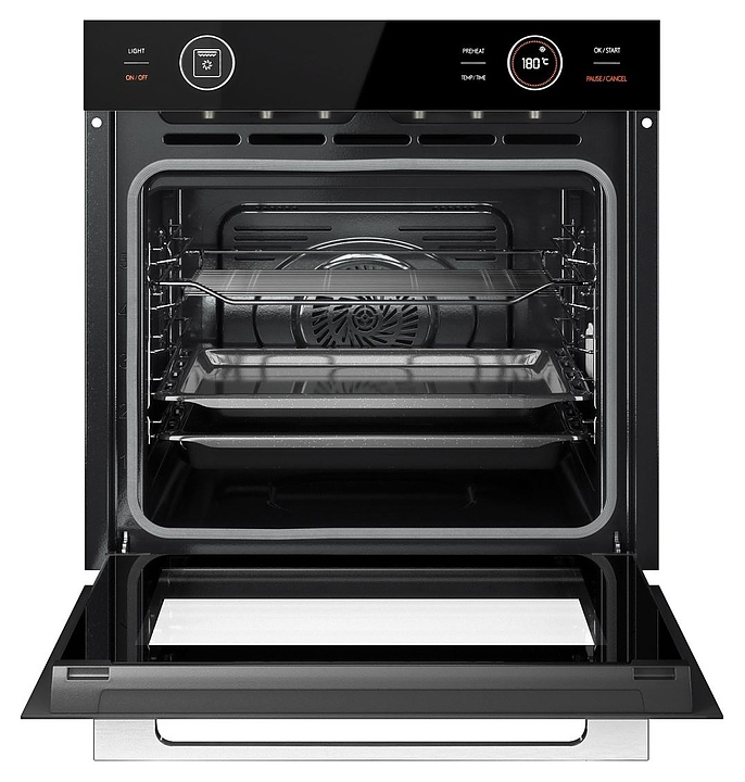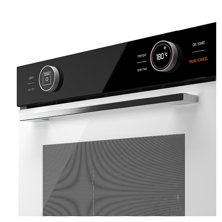 Электрический духовой шкаф Kuppersberg HT 612 White предназначен для приготовления большого ассортимента блюд в домашних условиях. Модель оснащена камерой с расположенными в задней стенке вентилятором и кольцевым нагревательным элементом, верхним и нижним нагревательными элементами, верхним грилем, 2 боковыми стойками с 5 уровнями направляющих для противней, откидной дверью со смотровым окном и уплощенной горизонтальной рукояткой, кабелем питания, электромеханической панелью управления с функциональными сенсорными клавишами, 2 цилиндрическими поворотными переключателями и интегрированными в них светодиодными дисплеями с белой подсветкой индикации. Корпус выполнен из высококачественной стали, верхняя панель черного цвета и дверь белого цвета с полным фронтальным остеклением без винтового крепежа, боковые стойки, направляющие и решетка для гриля с хромированным покрытием, противни – из металла с эмалированным покрытием, фурнитура с серебристой поверхностью. В комплект поставки входят решетка для гриля, 2 противня: стандартный и глубокий, инструкция по эксплуатации и гарантийный талон. Особенности: