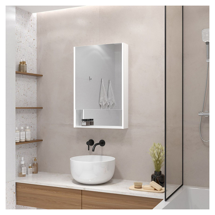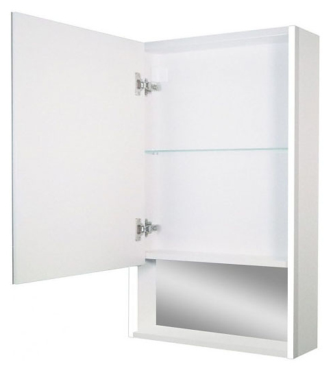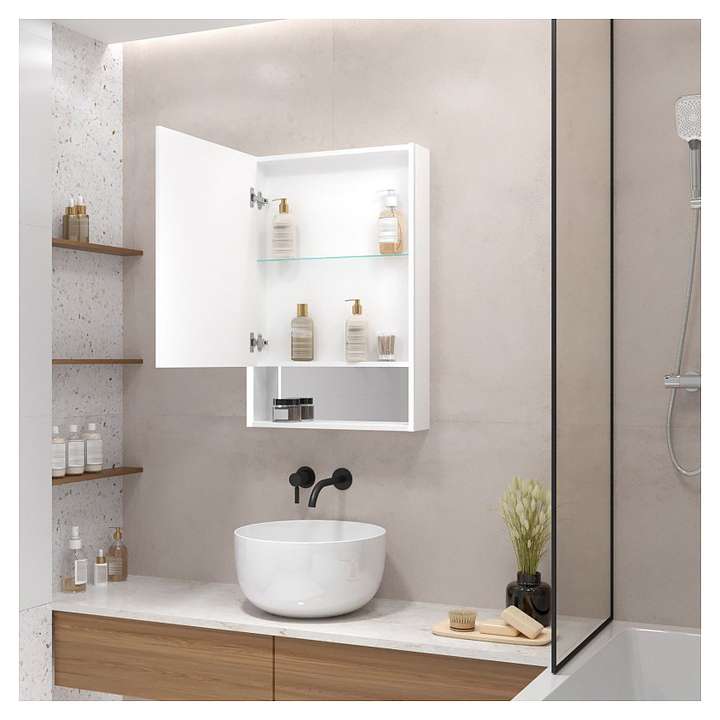 Зеркальный шкаф Art&Max Foggia AM-Fog-600-800-1D-L-DS-F-White дополнит интерьер любой ванной комнаты. Благодаря подвесной конструкции модель не занимает много места и позволяет экономить пространство. Модель оснащена LED-подсветкой, левой распашной дверцей, полкой в секции и открытой полкой в нижней части шкафа. Датчик движения с функцией изменения яркости подсветки реагирует на взмах руки. Питание светильника осуществляется от сети через блок питания постоянного напряжения. Корпус выполнен из влагостойкой ЛДСП, полочка - из стекла. В комплект поставки входят зеркало-шкаф, провод, розетка и навес. Дополнительные характеристики: