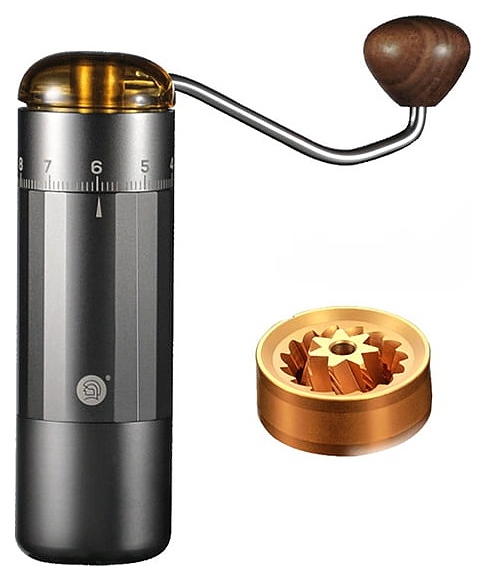 Механическая кофемолка ZeroHero Z5 используется в офисах, гостиницах и домашних усдлвиях для приготовления молотого кофе из зерен для альтернативных способов заваривания – турка, гейзерная кофеварка, аэропресс, пуровер, капельная кофеварка, френч-пресс. Модель оснащена удобной изогнутой рукояткой с массивным наконечником. Корпус цилиндрической формы выполнен из анодированного алюминиевого сплава с покрытием серого оттенка, наконечник рукоятки – из массива двевесины, жернова – из углеродистой нержавеющей стали с титановым напылением, крышка – из поликарбоната, упаковка – картонная коробка.