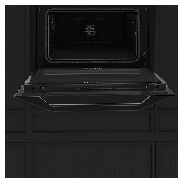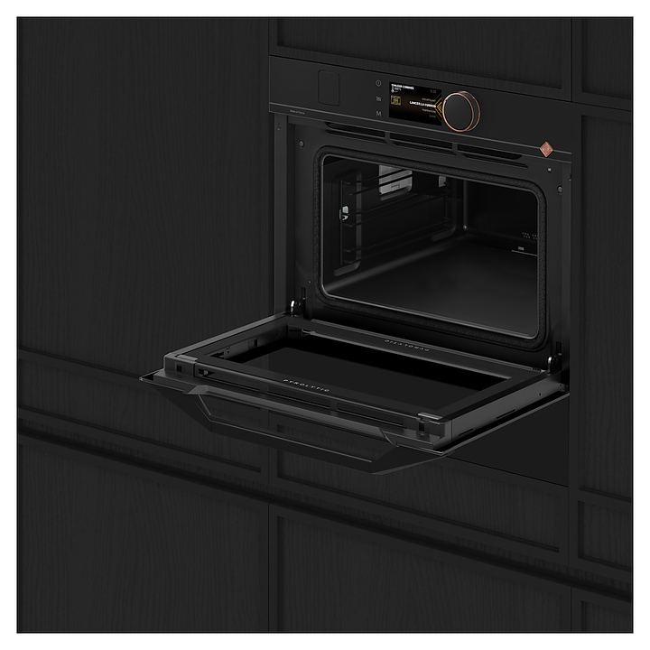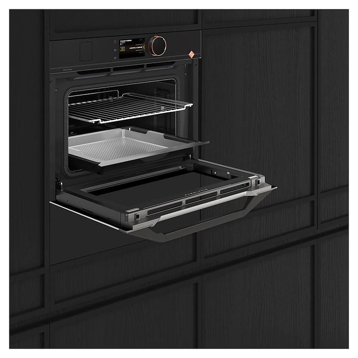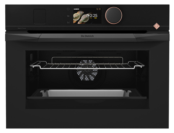Встраиваемый электрический духовой шкаф De Dietrich DKR4741Hпредназначен для приготовления большого ассортимента блюд в домашних условиях. Модель оснащена камерой с расположенными в задней стенке вентилятором и кольцевым нагревательным элементом, верхним и нижним нагревательными элементами, верхним грилем, встроенным парогенератором, 2 боковыми стойками с 3 уровнями направляющих для противней, откидной дверью со смотровым окном и дугообразной горизонтальной рукояткой, кабелем питания, панелью управления «Эксперт» с поворотно-нажимным переключателем и полноцветным сенсорным TFT-дисплеем высокой четкости. Корпус выполнен из высококачественной стали, верхняя фронтальная панель и дверь с антикоррозийным покрытием черной порошковой краской, сплошной противень – из эмалированной стали, перфорированный противень – из нержавеющей стали, боковые стойки и решетка с хромированной поверхностью, внутренняя облицовка камеры с эмалированным покрытием легкой очистки, рукоятка с матовым черным покрытием, переключатель черного цвета с окантовкой медного оттенка.