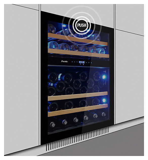 Винный шкаф Pando PVMBP 60-45 CRR предназначен для хранения при оптимальных условиях и предпродажной демонстрации бутилированного вина различных сортов в барах, ресторанах, специализированных магазинах, подсобных складских помещениях, а также домашних условиях. Модель оснащена холодильной камерой с 2 температурными зонами, правосторонней распашной дверью, внутренней сенсорной панелью управления и светодиодными цифровыми дисплеями с голубой подсветкой индикации. Корпус выполнен из стали с антикоррозийным покрытием черного цвета, дверь с полным фронтальным остеклением без винтового крепежа из закаленного стекла с прозрачной дымчатой тонировкой, внутренняя облицовка камеры черного цвета, полки – из массива буковой древесины. В комплект поставки входят 4 съемные полки с направляющими для размещения бутылок, инструкция по эксплуатации, гарантийный талон и заводская упаковка. Особенности: