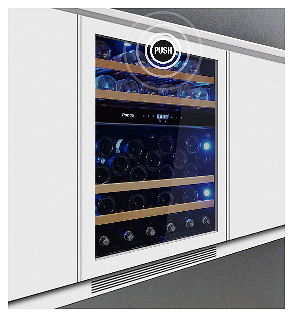 Винный шкаф Pando PVMBP 60-45 PAR предназначен для хранения при оптимальных условиях и предпродажной демонстрации бутилированного вина различных сортов в барах, ресторанах, специализированных магазинах, подсобных складских помещениях, а также домашних условиях. Модель оснащена холодильной камерой с 2 температурными зонами, правосторонней распашной дверью, внутренней сенсорной панелью управления и светодиодными цифровыми дисплеями с голубой подсветкой индикации. Корпус и рама двери выполнены из стали с антикоррозийным покрытием, остекление двери – из закаленного стекла с прозрачной дымчатой тонировкой, внутренняя облицовка камеры черного цвета, полки – из массива буковой древесины. В комплект поставки входят 4 съемные полки с направляющими для размещения бутылок, инструкция по эксплуатации, гарантийный талон и заводская упаковка. Навесная фасадная панель не входит в комплект поставки и приобретается отдельно. Особенности: