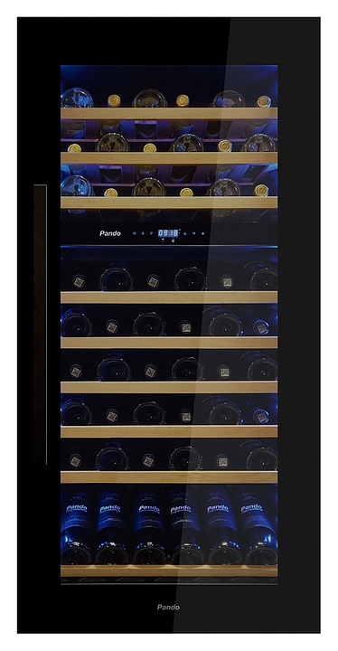 Винный шкаф Pando PVMAV 124-70 CRL предназначен для хранения при оптимальных условиях и предпродажной демонстрации бутилированного вина различных сортов в барах, ресторанах, специализированных магазинах, подсобных складских помещениях, а также домашних условиях. Модель оснащена холодильной камерой с 2 температурными зонами, левосторонней распашной дверью, вертикальной рукояткой, внутренней сенсорной панелью управления и светодиодными цифровыми дисплеями с голубой подсветкой индикации. Корпус выполнен из стали с антикоррозийным покрытием черного цвета, дверь с полным фронтальным остеклением без винтового крепежа из закаленного стекла с прозрачной дымчатой тонировкой, рукоятка – из анодированного алюминия с черной поверхностью, внутренняя облицовка камеры черного цвета, полки – из массива буковой древесины. В комплект поставки входят 9 съемных полок с направляющими для размещения бутылок, крепеж для рукоятки, инструкция по эксплуатации, гарантийный талон и заводская упаковка. Особенности: