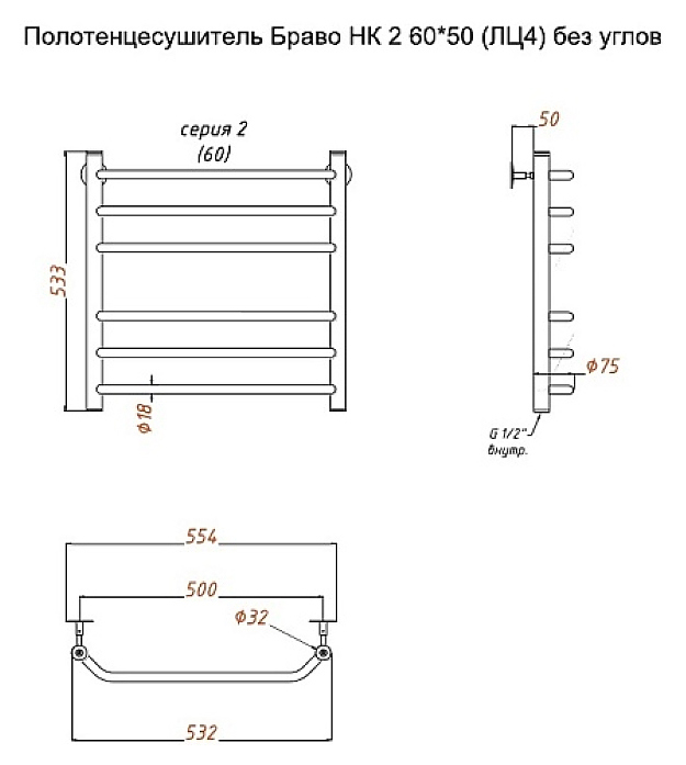 Полотенцесушитель водяной Тругор Браво НК 2 60х50 см (без углов), хром