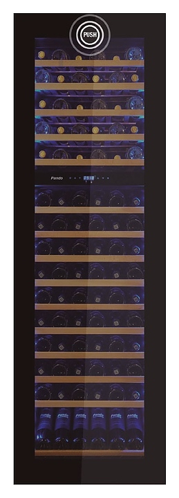 Винный шкаф Pando PVMAVP 178-112 CRL предназначен для хранения при оптимальных условиях и предпродажной демонстрации бутилированного вина различных сортов в барах, ресторанах, специализированных магазинах, подсобных складских помещениях, а также домашних условиях. Модель оснащена холодильной камерой с 2 температурными зонами, левосторонней распашной дверью, внутренней сенсорной панелью управления и светодиодными цифровыми дисплеями с голубой подсветкой индикации. Корпус выполнен из стали с антикоррозийным покрытием черного цвета, дверь с полным фронтальным остеклением без винтового крепежа из закаленного стекла с прозрачной дымчатой тонировкой, внутренняя облицовка камеры черного цвета, полки – из массива буковой древесины.