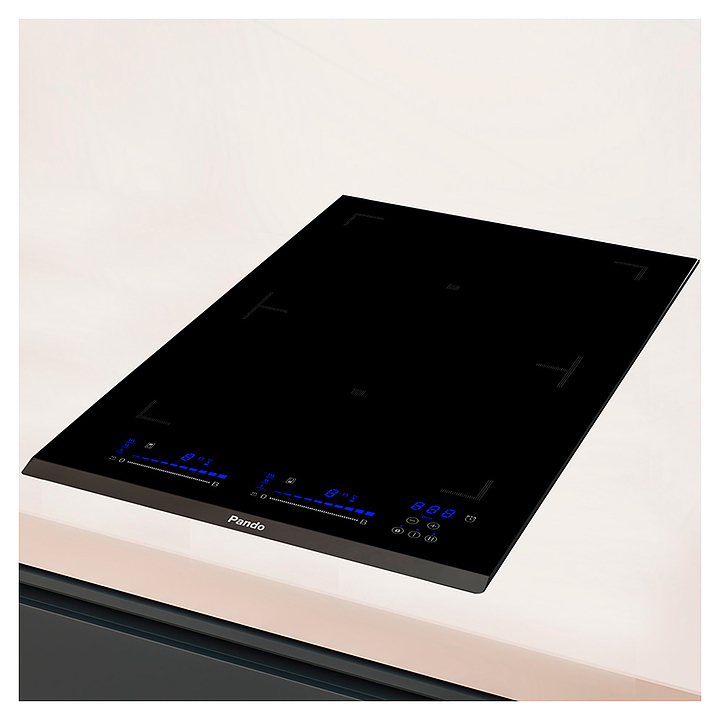 Индукционная варочная панель Pando PI-DOMпредназначена для приготовления большого ассортимента блюд в домашних условиях. Принцип работы основан на непосредственном нагреве металлической посуды создаваемыми высокочастотным магнитным полем индуцированными вихревыми токами. Модель оснащена 2 варочными зонами, кабелем питания, сенсорной панелью управления и светодиодными дисплеями с голубой подсветкой индикации. Рабочая поверхность выполнена из высококачественной стеклокерамики Keraspectrum черного цвета со скошенной фронтальной кромкой.