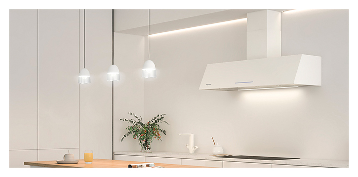 Пристенная кухонная вытяжка Pando P-2010/120 BLANCO V.850 предназначена для очистки воздуха от продуктов горения, копоти и запахов в процессе приготовления пищи путем принудительной вентиляции в домашних условиях. Модель оснащена вентилятором с электродвигателем, кабелем питания и кнопочной панелью управления с голубой подсветкой. Корпус в форме прямоугольно ориентированного купола с наклонным фронтом выполнен из высококачественной стали с покрытием белого цвета (RAL 9003), жироулавливающий фильтр – из нержавеющей стали. В комплект поставки входят набор монтажных креплений, инструкция по эксплуатации, гарантийный талон и заводская упаковка. Функция AirLink доступна только при заказе с совместимой варочной панелью. Особенности: