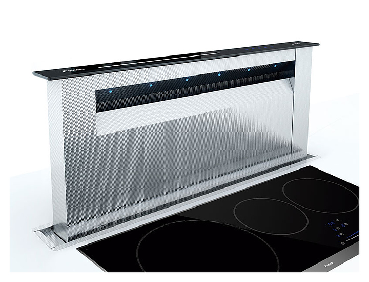 Встраиваемая кухонная вытяжка Pando E-350/90 IX V.1350 INT/EXT предназначена для очистки воздуха от продуктов горения, копоти и запахов в процессе приготовления пищи путем принудительной вентиляции в домашних условиях. Модель оснащена вентилятором с электродвигателем, кабелем питания и сенсорной панелью управления. Прибор монтируется в столешницу рядом с варочной поверхностью и имеет компактную выдвижную конструкцию. Фронтальная панель выполнена из нержавеющей стали с текстурной поверхностью серебристого оттенка, жироулавливающий фильтр – из алюминия. В комплект поставки входят набор монтажных креплений, инструкция по эксплуатации, гарантийный талон и заводская упаковка. Особенности: