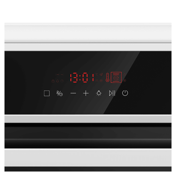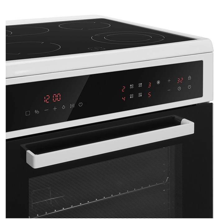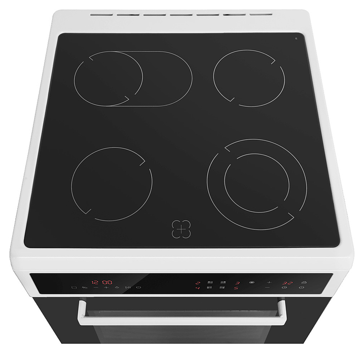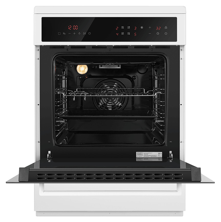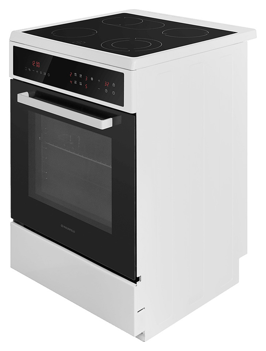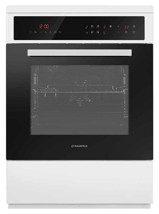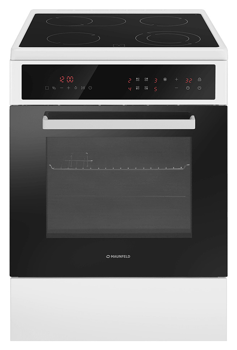Напольная электрическая плита Maunfeld MEC611CW10TDпредназначена для приготовления широкого ассортимента блюд и быстрого разогрева готовых блюд в гостиничных комплексах, офисах и домашних условиях. Модель оснащена рабочей поверхностью с 4 независимыми варочными зонами различной мощности, духовым шкафом с расположенным в задней стенке вентилятором, верхним и нижним нагревательными элементами, верхним грилем, откидной дверью, смотровым окном, горизонтальной рукояткой, 2 боковыми стойками с 5 уровнями направляющих для противней, кабелем питания с вилкой, расположенными в верхней части фронта панелями управления с сенсорными функциональными клавишами и цифровыми дисплеями с красной подсветкой индикации. Корпус выполнен из стали с антикоррозийным покрытием фронта, боковин и тыльной решетки белого цвета, задняя стенка – из оцинкованной стали, дверь с черным покрытием и полным фронтальным остеклением жаропрочным стеклом без винтового крепежа, верхняя панель черного цвета с частичным остеклением, рабочая поверхность – из высококачественной износостойкой стеклокерамики CERAN черного цвета, противень – из стали с эмалированной поверхностью, боковые стойки, решетка для гриля и прихват – из стали с никелированной и хромированной поверхностью, рукоятка с белой поверхностью.