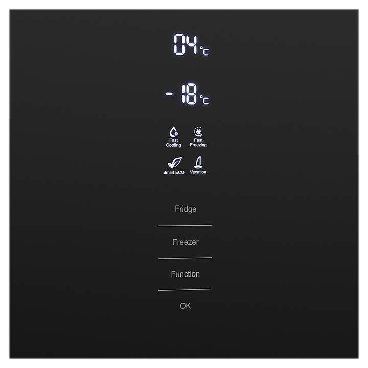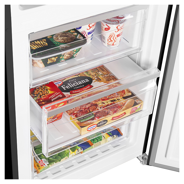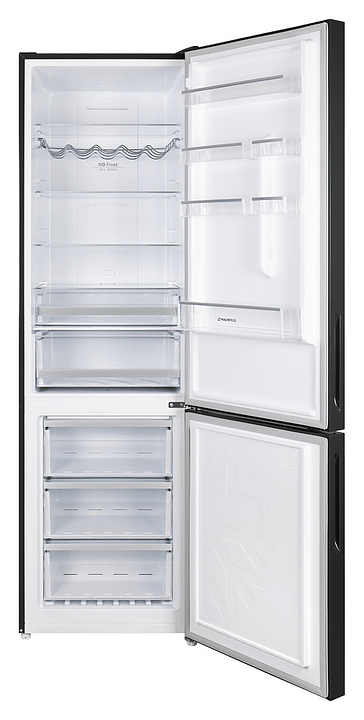 Холодильник Maunfeld MFF200NFB Inverter предназначен для охлаждения, замораживания, кратковременного и длительного хранения пищевых продуктов и напитков в гостиничных комплексах, офисах, а также домашних условиях. Модель оснащена холодильной камерой сверху, морозильной камерой снизу, правосторонними перенавешиваемыми распашными дверьми, кабелем питания с евровилкой и расположенной на верхней двери сенсорной панелью управления с 2 цифровыми дисплеями. Фасад выполнен из стали с покрытием черного цвета и полным остеклением закаленным стеклом без винтового крепежа, боковины – из стали с покрытием в цвет фасада, внутренняя облицовка камер – из белого антибактериального пластика, плоские полки – из прозрачного закаленного стекла, навесные полки – из прозрачного пластика, ящики – из белого пластика с прозрачным фронтом, ящики и полки декорированы окантовками серебристого оттенка, упаковка – из гофрокартона, полимерной пленки и полистирола.