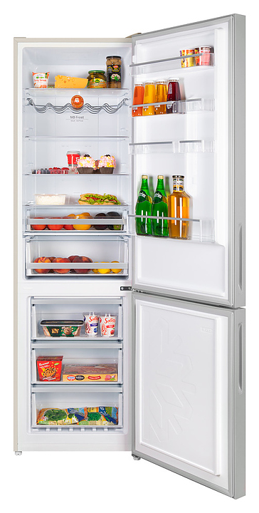 Холодильник Maunfeld MFF200NFBG Inverter предназначен для охлаждения, замораживания, кратковременного и длительного хранения пищевых продуктов и напитков в гостиничных комплексах, офисах, а также домашних условиях. Модель оснащена холодильной камерой сверху, морозильной камерой снизу, правосторонними перенавешиваемыми распашными дверьми, кабелем питания с евровилкой и расположенной на верхней двери сенсорной панелью управления с 2 цифровыми дисплеями. Фасад выполнен из стали с покрытием бежевого оттенка и полным остеклением закаленным стеклом без винтового крепежа, боковины – из стали с антикоррозийным покрытием, внутренняя облицовка камер – из белого антибактериального пластика, плоские полки – из прозрачного закаленного стекла, навесные полки – из прозрачного пластика, ящики – из белого пластика с прозрачным фронтом, ящики и полки декорированы окантовками серебристого оттенка, упаковка – из гофрокартона, полимерной пленки и полистирола.