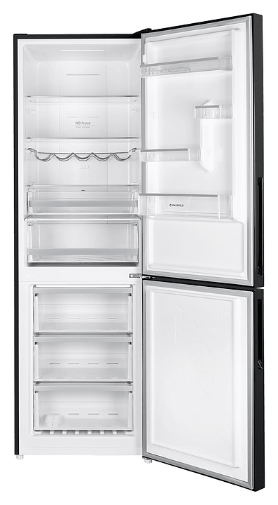 Холодильник Maunfeld MFF185NFB Inverter предназначен для охлаждения, замораживания, кратковременного и длительного хранения пищевых продуктов и напитков в гостиничных комплексах, офисах, а также домашних условиях. Модель оснащена холодильной камерой сверху, морозильной камерой снизу, правосторонними перенавешиваемыми распашными дверьми, кабелем питания с евровилкой и расположенной на верхней двери сенсорной панелью управления с 2 цифровыми дисплеями. Фасад выполнен из стали с покрытием черного цвета и полным остеклением закаленным стеклом без винтового крепежа, боковины – из стали с антикоррозийным покрытием в цвет фасада, внутренняя облицовка камер – из белого антибактериального пластика, плоские полки – из прозрачного закаленного стекла, навесные полки – из прозрачного пластика, ящики – из белого пластика с прозрачным фронтом, ящики и полки декорированы окантовками серебристого оттенка, упаковка – из гофрокартона, полимерной пленки и полистирола.